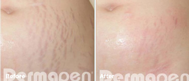 Stretch marks are linear, smooth bands on the skin that, depending on skin color, can appear as red or purple and which can fade over time to leave silvery pale marks. Occurring in 40-90% of women as well as many men including bodybuilders, stretch marks can appear following rapid repeated over-stretching of the skin over weak connective tissue.